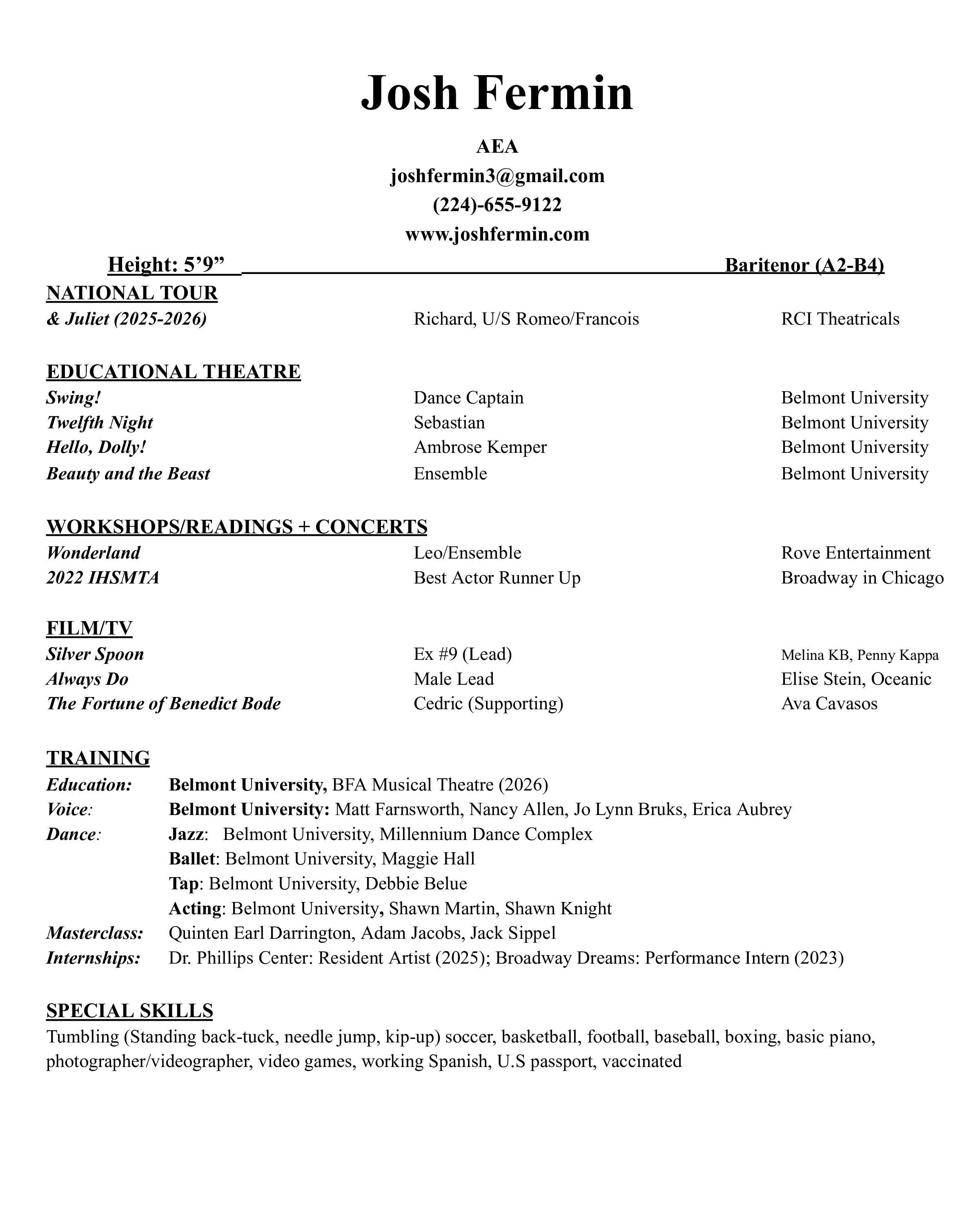 Josh is thrilled to join the North American Tour of the hit Broadway musical, & Juliet! He will play the role of Richard, and understudy Romeo and Francois.